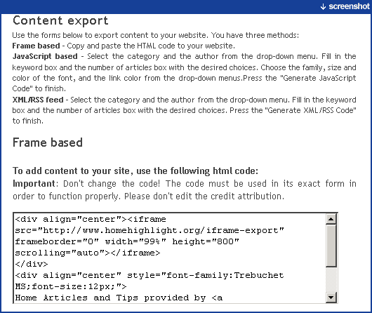 Log in to your HomeHighlight account. Press the “Content Export” link. To customize your code, press the “Customize frame export” link.